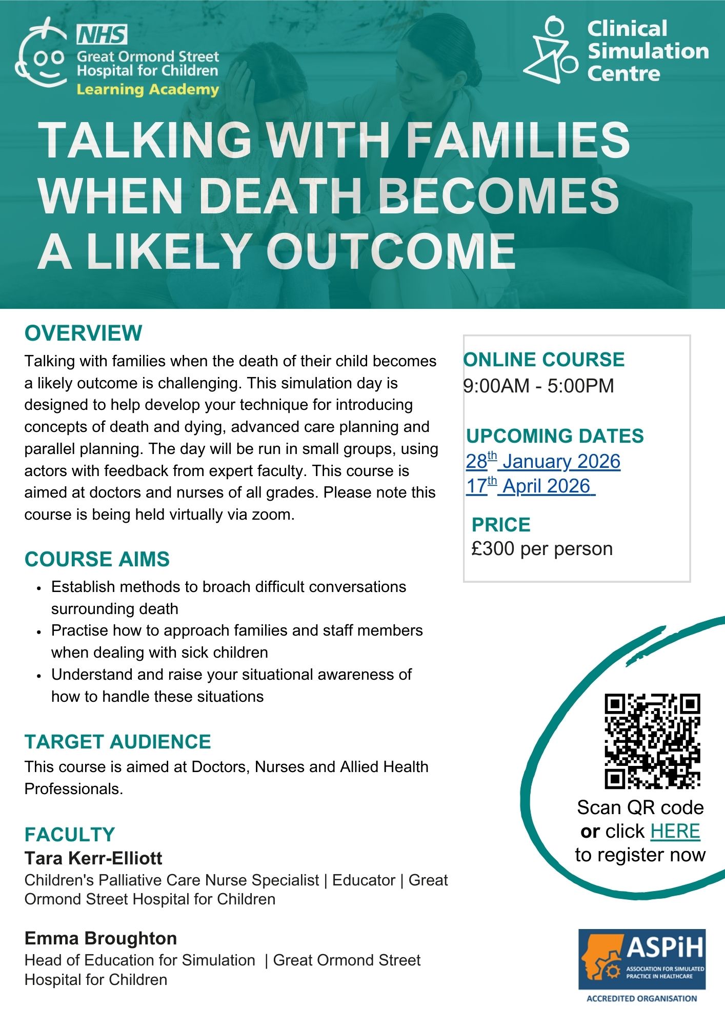 Talking with families when the death of their child becomes a likely outcome is challenging. This simulation day is designed to help develop your technique for introducing concepts of death and dying, advanced care planning and parallel planning.