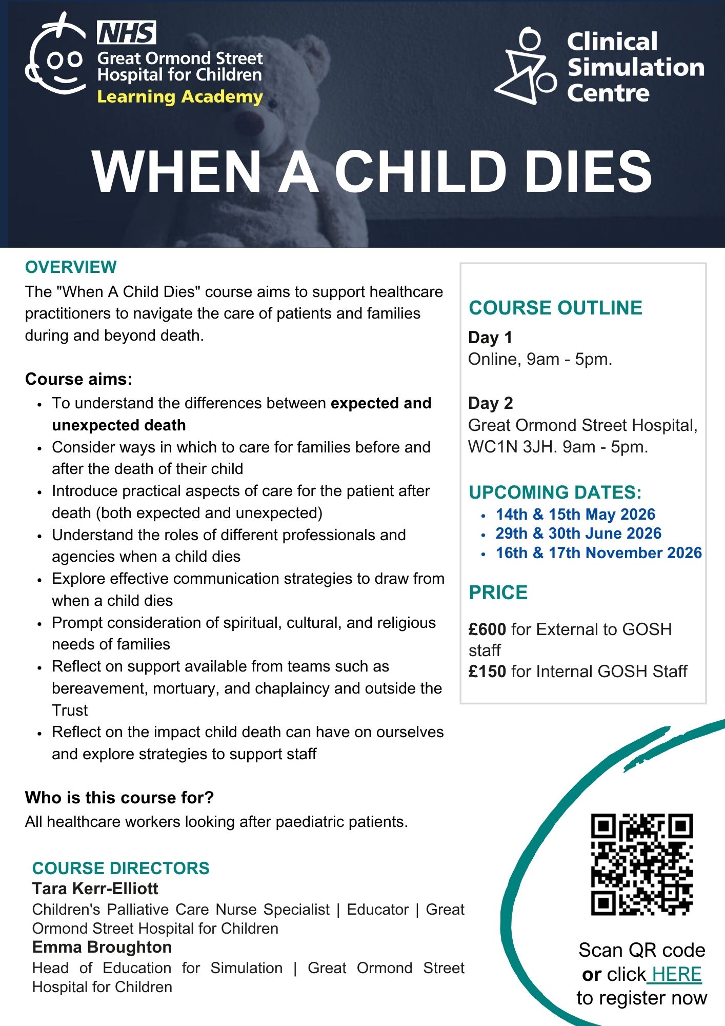 The 'When A Child Dies' course aims to support healthcare practitioners to navigate the care of patients and families during and beyond death. The course provides an opportunity to explore conversations and practical considerations around anticipation of death, the death of a patient, and post death care.